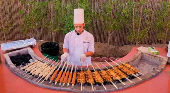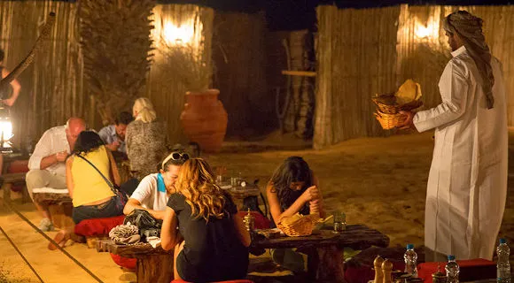 As the evening unfolds, enjoy a lavish BBQ dinner under the stars featuring a variety of Middle Eastern delicacies. Be entertained with live performances including Tanura dance, fire shows, and belly dancing, providing the perfect end to an unforgettable desert adventure.